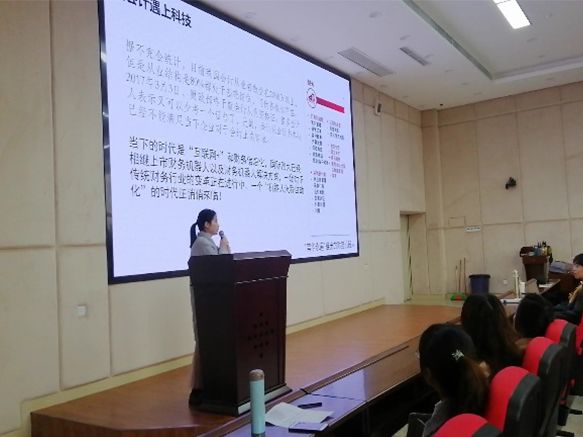 宣讲会中,浪潮铸远合作伙伴成都邦道科技有限公司陶思维经理给同学们介绍了浪潮铸远的发展史,以及浪潮的发展领域和未来方向。并对当下会计行业的发展趋势进行分析,着重讲述了“互联网+”和智能财务的重要性。期间,不仅讲述了当下会计人才的发展方向,还介绍了智能财务云中心的教学规划、职能分工、日常工作等相关内容。