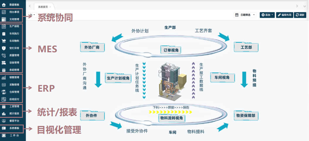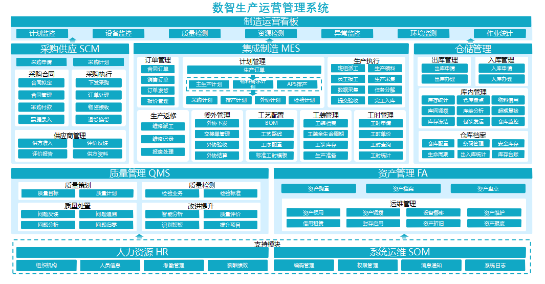 数智制造运行MOM以生产过程管控为核心,通过生产排程、执行调度、车间物流以及质量追溯等关键应用,并将供应链管理、人员管理、设备管理、能源管理等企业核心资源整合,形成一体化业务运营平台。同时,系统具有精细化、柔性化、协同化等特点,帮助企业消除信息孤岛,实现业财融合、降本增效,以数据驱动决策,助力企业实现数字化升级。